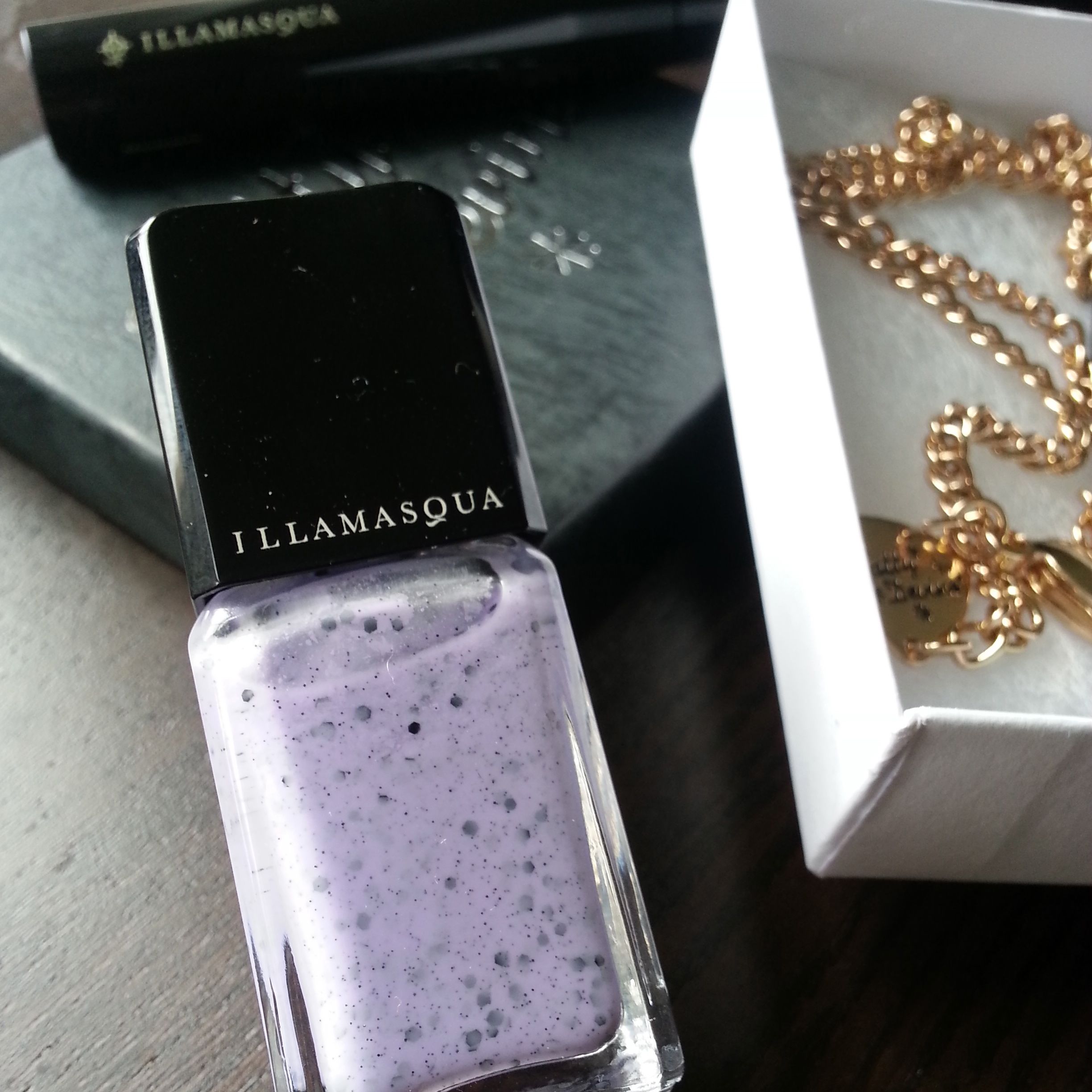 As a thanks for attending the workshop, we each got 20% off Illamasqua’s products, so I obviously went right over to the nail polishes. I considered getting some UV polish, but then settled on this lovely speckle polish in lilac. (I also got some new mascara, but that’s not nearly as interesting to look at.)