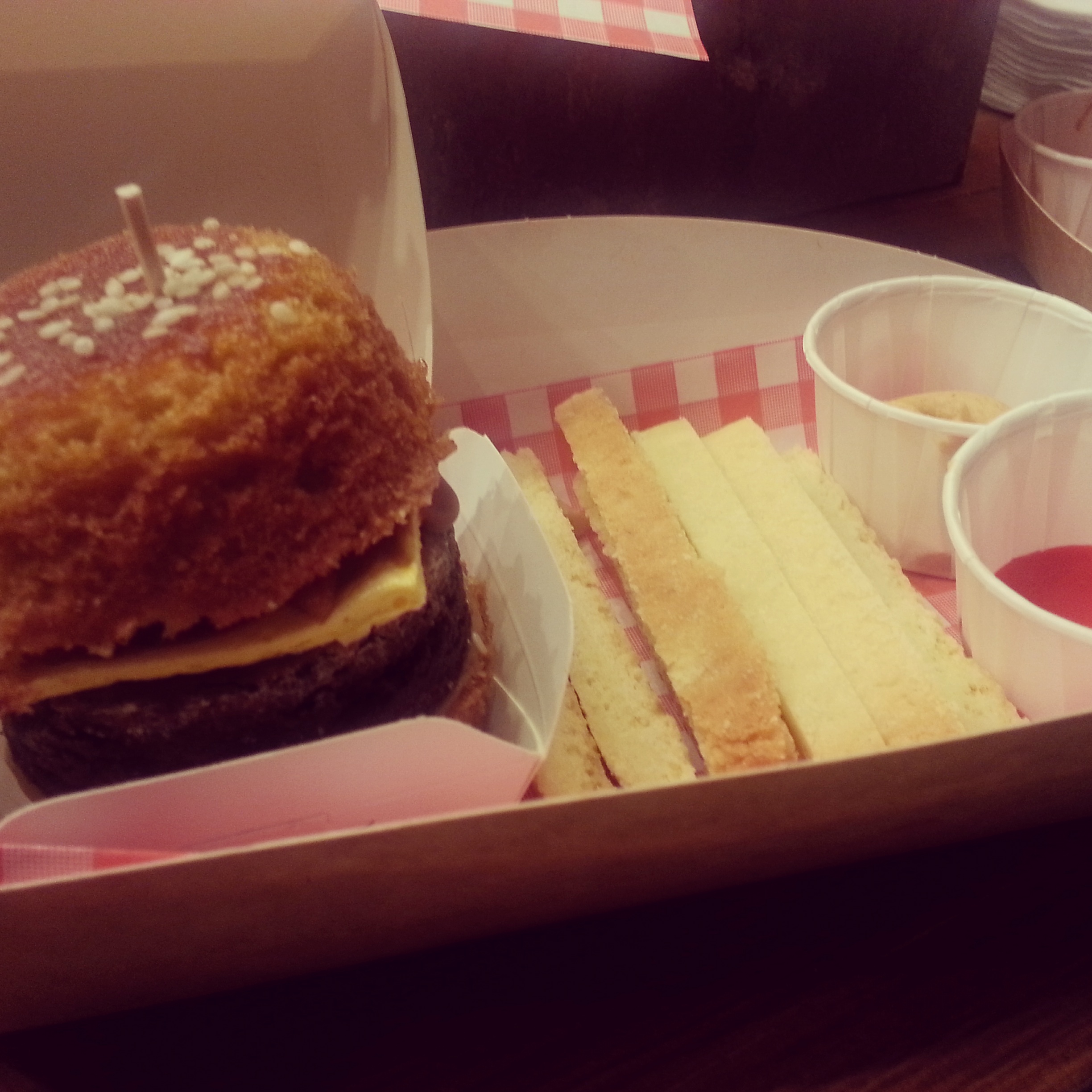 ‘Burger’ 5: Crumbs and Doilies Elvis Cake Burger, a chocolate and peanut brownie patty, banana marshmallow cheese, candied bacon and pb&j on a salted caramel bun; served with butter cookie chips and strawberry & yuzu ketchup and caramelised white chocolate mayo as a meal deal for £8