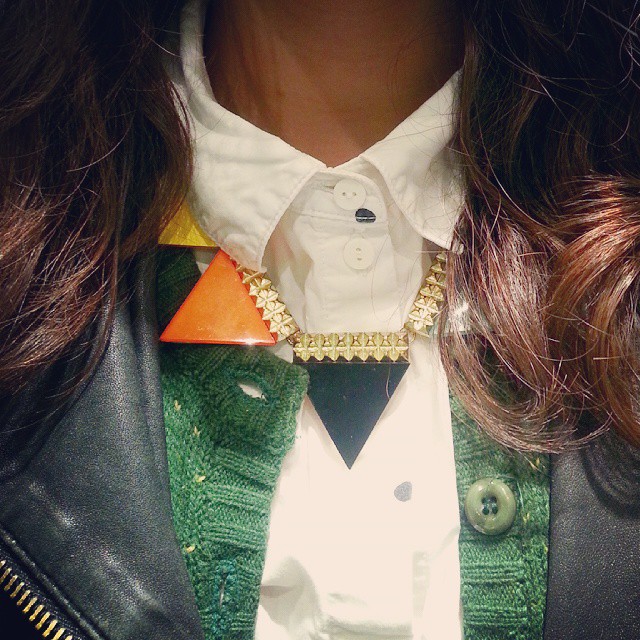 When it comes to work days, my autumn/winter uniform is pretty much a button down shirt, knitwear and skinny jeans finished off with a piece statement jewellery. Above are a few of my favourite looks recently, incorporating the pterodactyl necklace (£31.49 by Designosaur) that Jeff gave me for our first anniversary (and that I wore on our wedding day!), a Johnny Loves Rosie necklace from last year, and the DVF for My Little Box kiss broach that I received in October’s box. When it comes to statement jewellery, I’m all about anything fun, quirky and interesting – especially if it can be a conversation starter for those otherwise dull elevator trips up to the 5th floor!