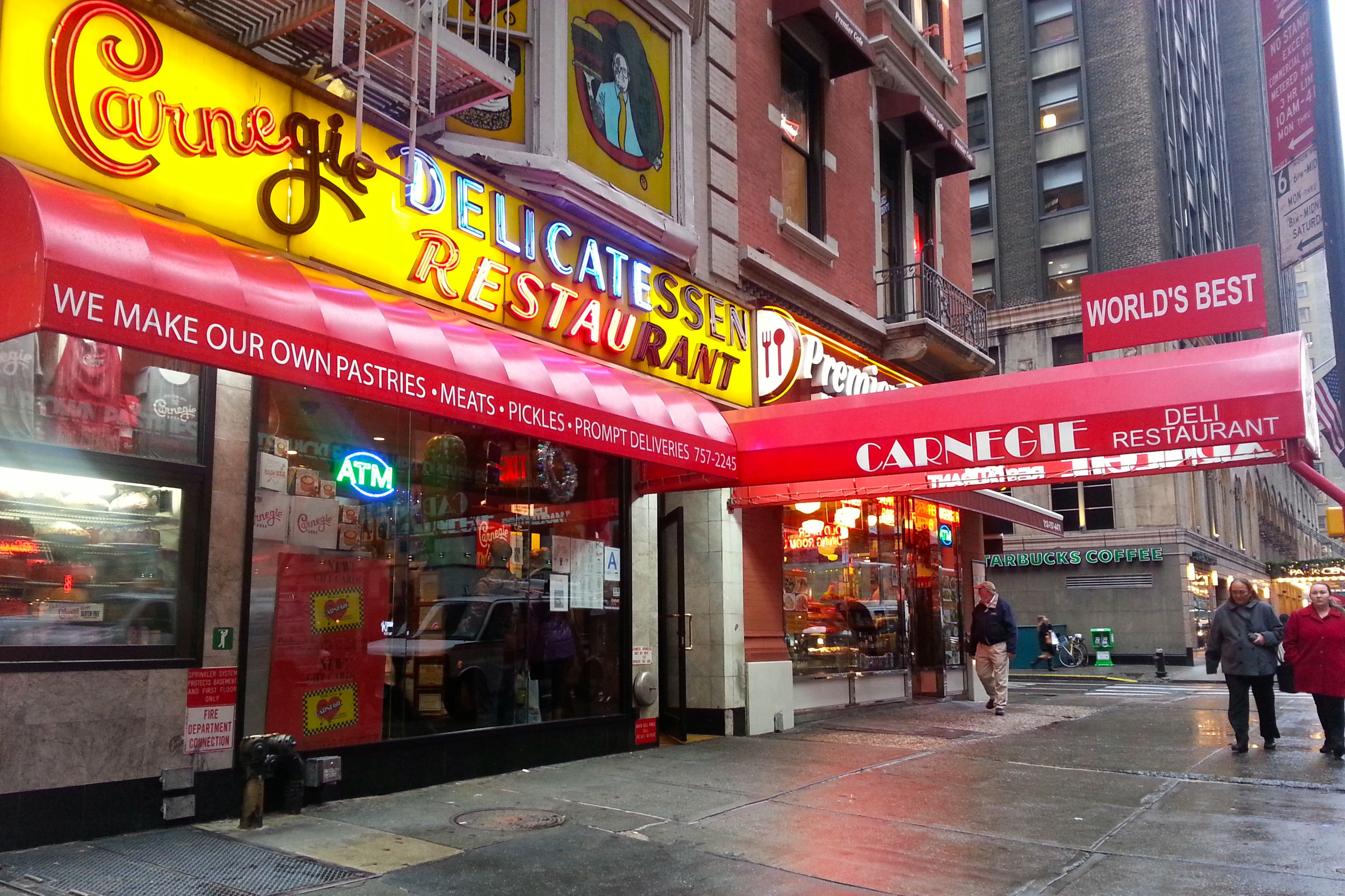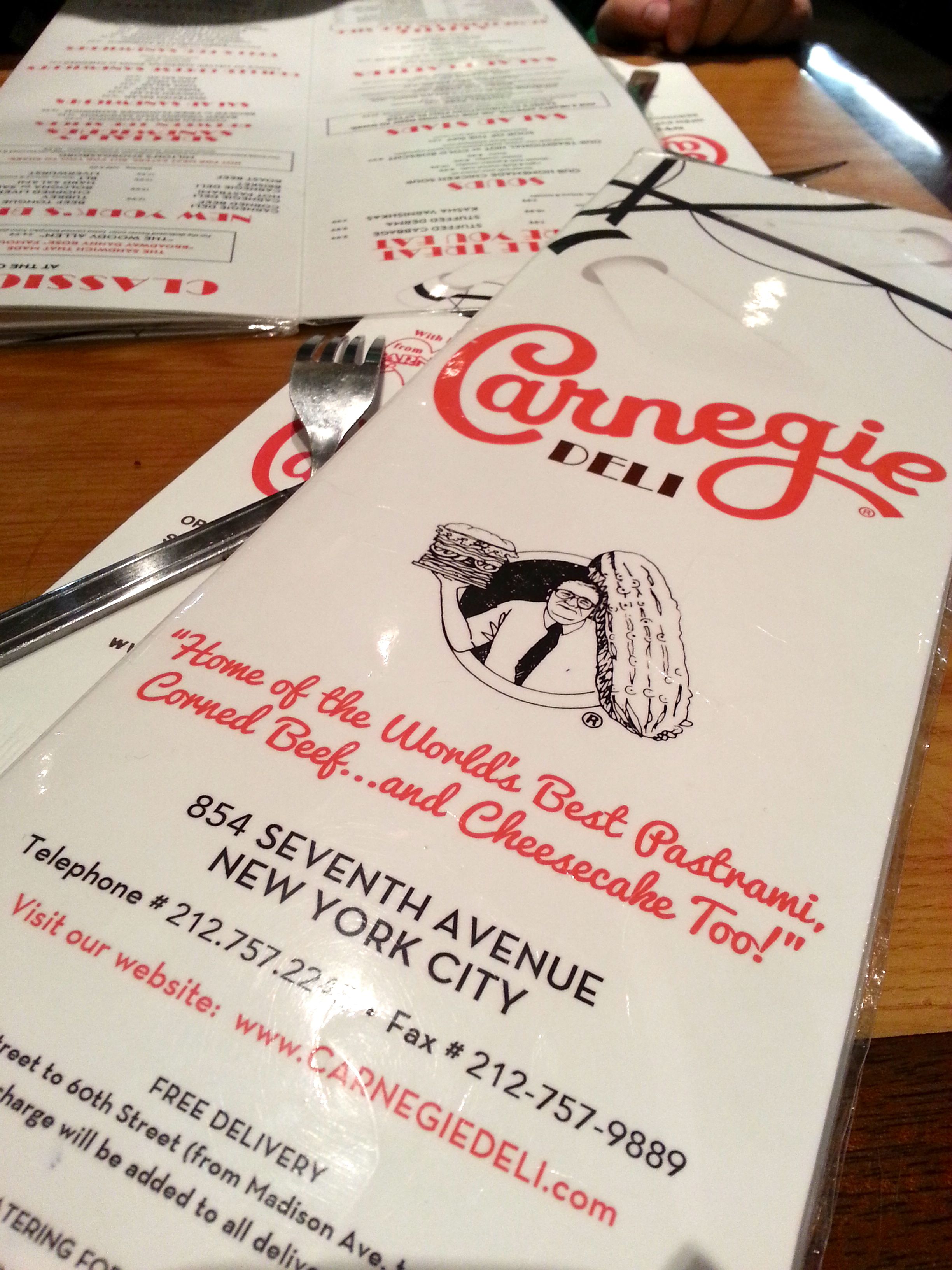 Boy oh boy, Carnegie Deli! When we first looked at the menu we thought the sandwiches all looked pretty pricey (about $18 each!) and then we go there. We sat down, and they gave us a bowl filled with massive (they were each the length of one of my fingers) and totally tasty pickles to munch on while we read the menu. Jeff got the corned beef and I got the hot pastrami, pictured both on its own and with me for scale. Luckily, they let you wrap up what you don’t finish so you can tuck in later!