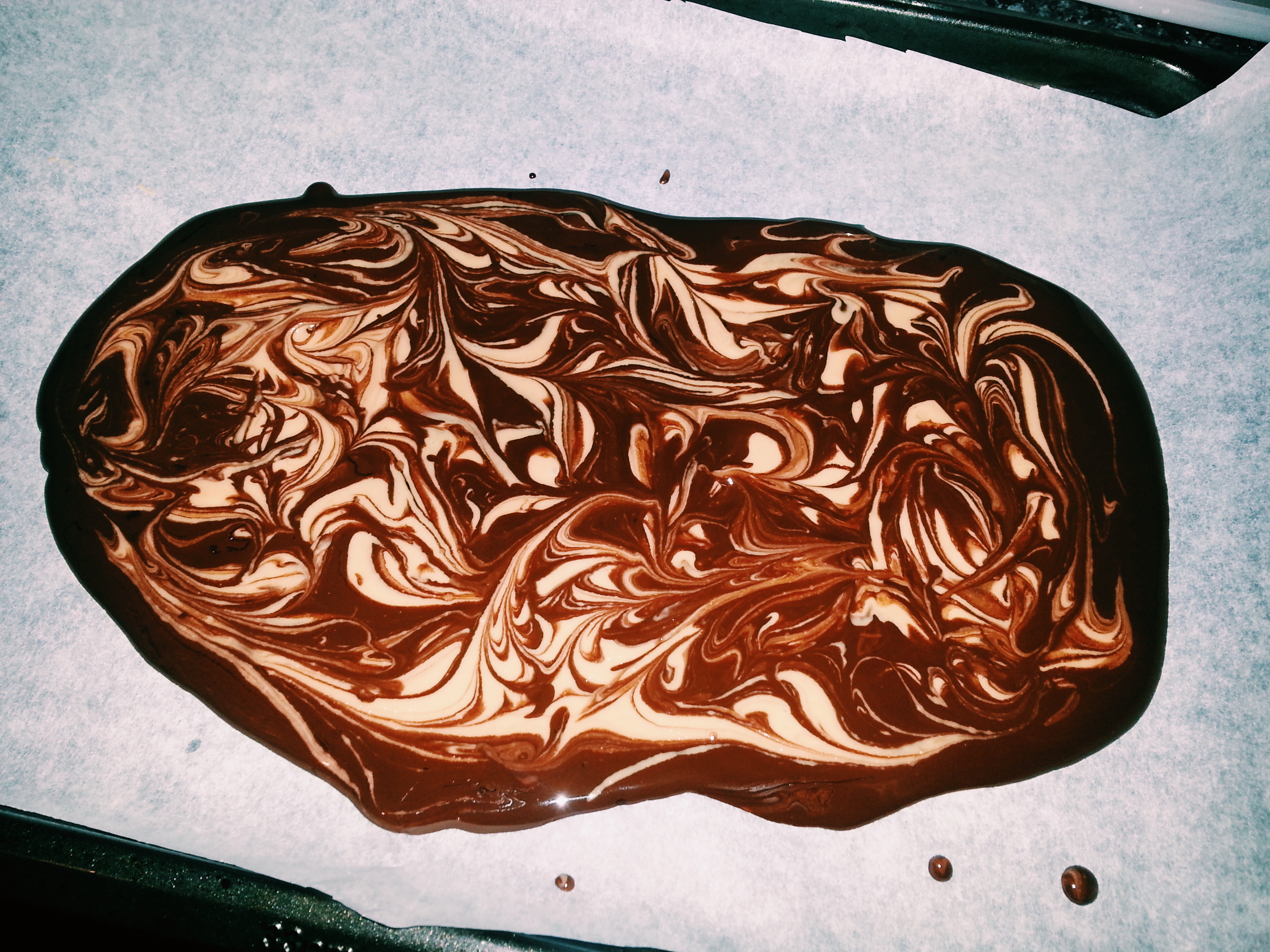 4. Spoon the melted chocolate onto the parchment paper into a thin layer; it won’t cover the whole area and it doesn’t need to look perfect.