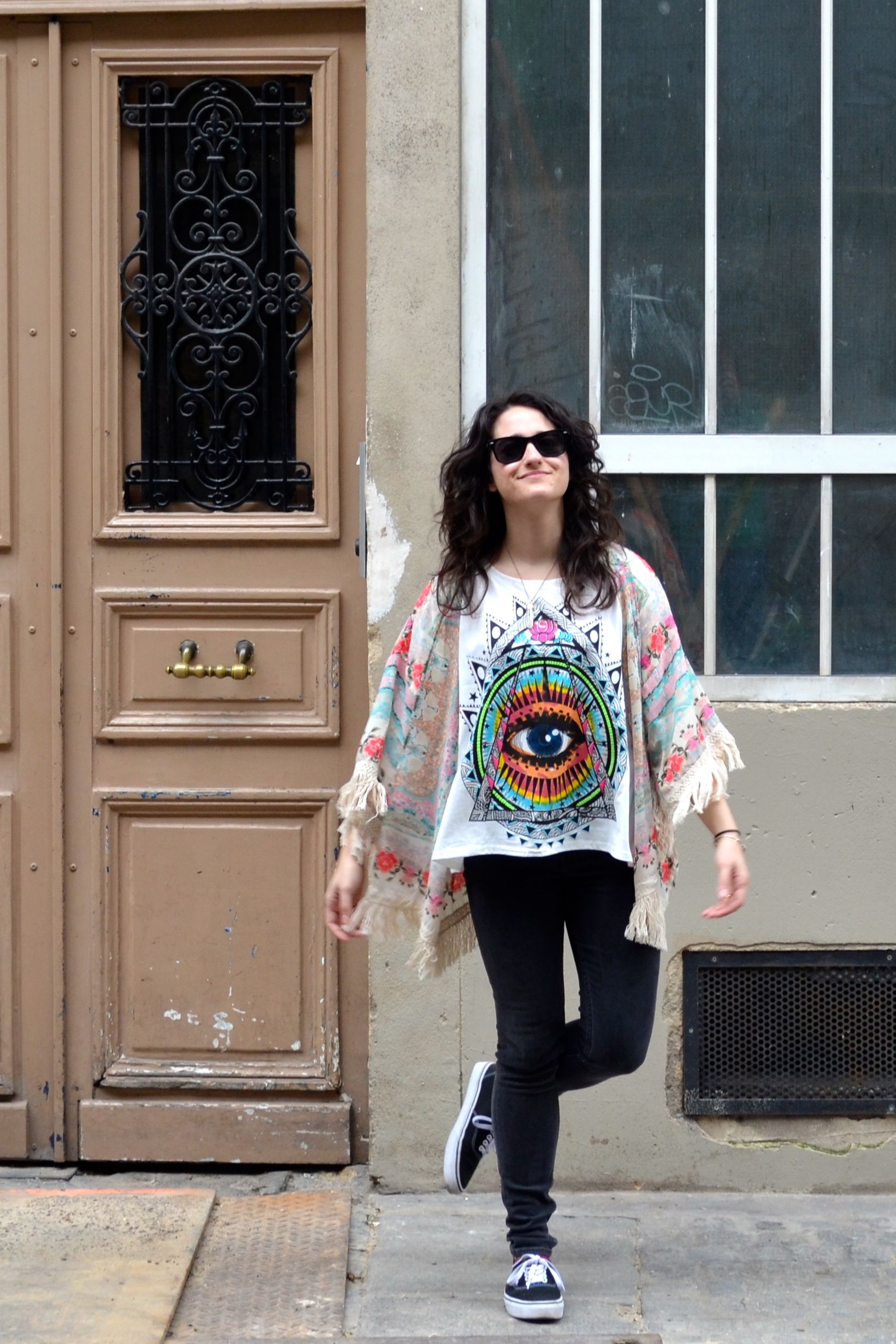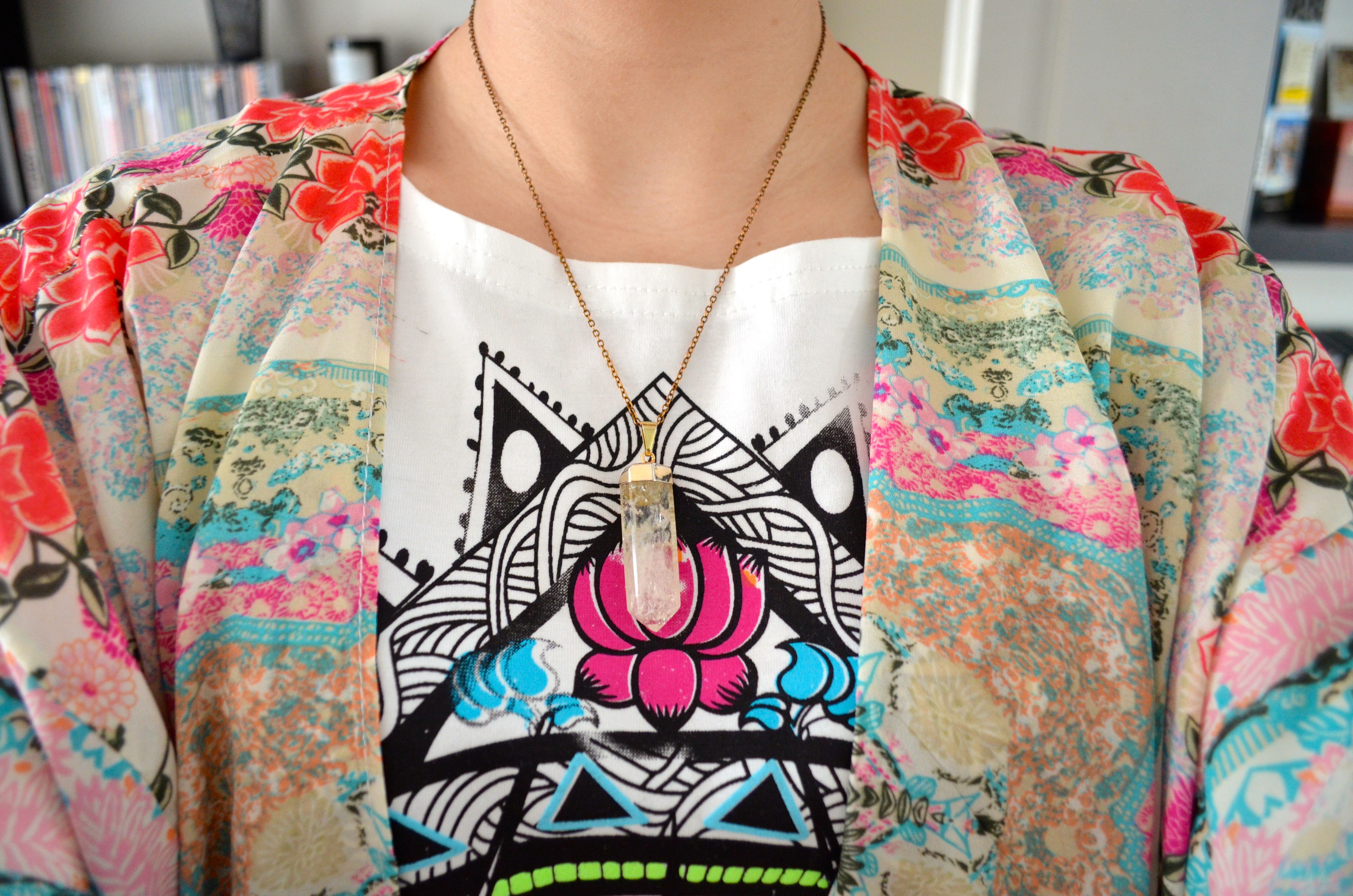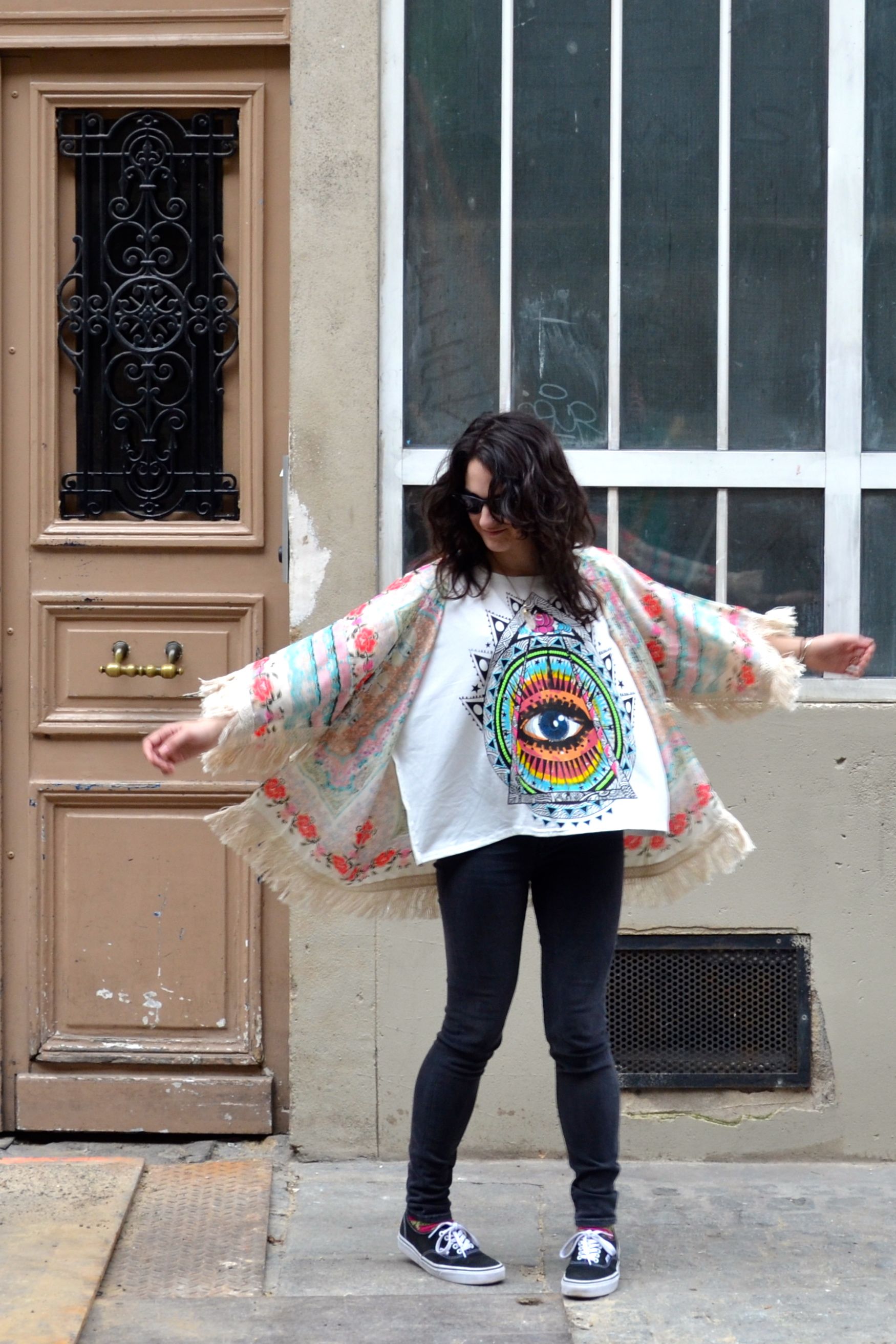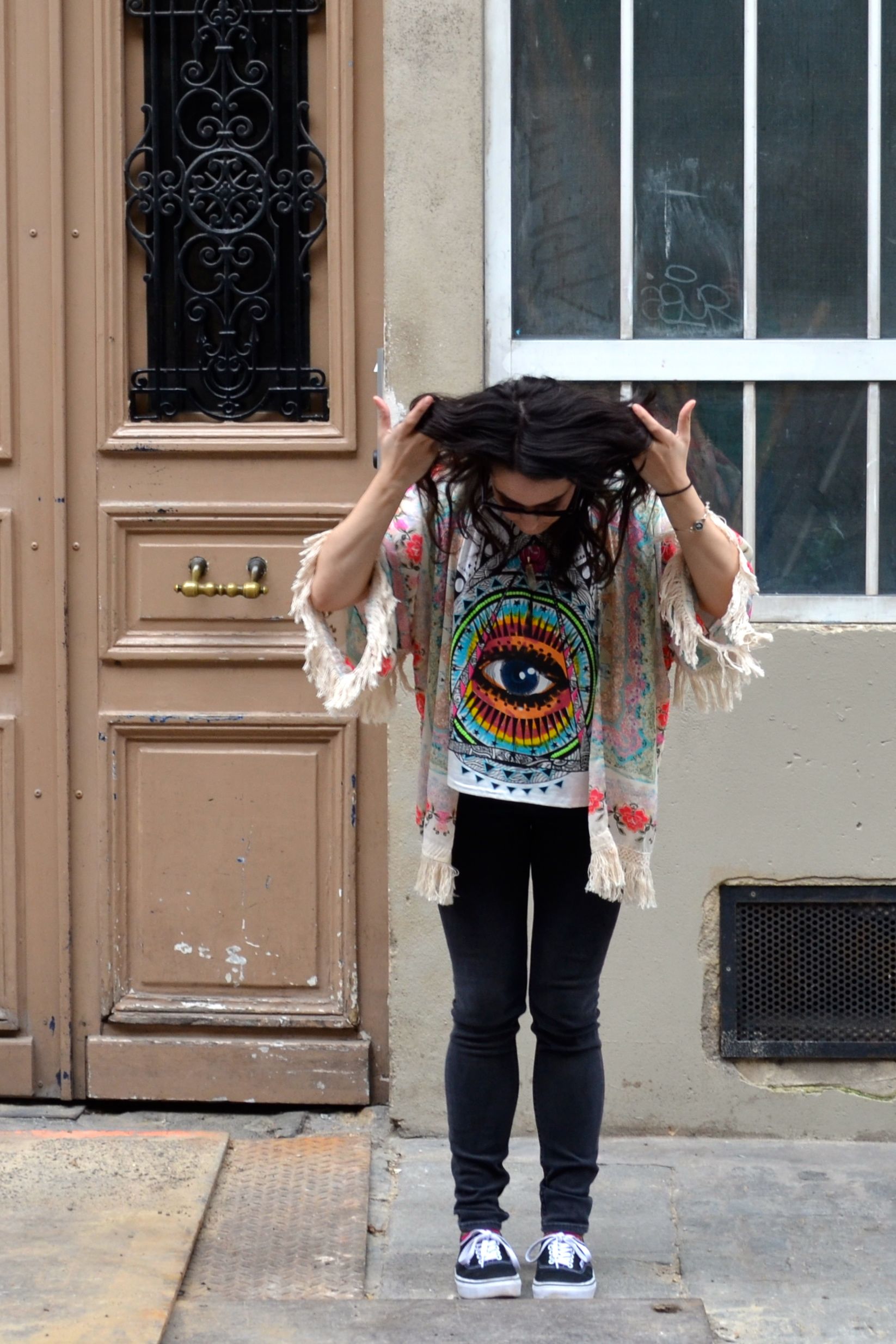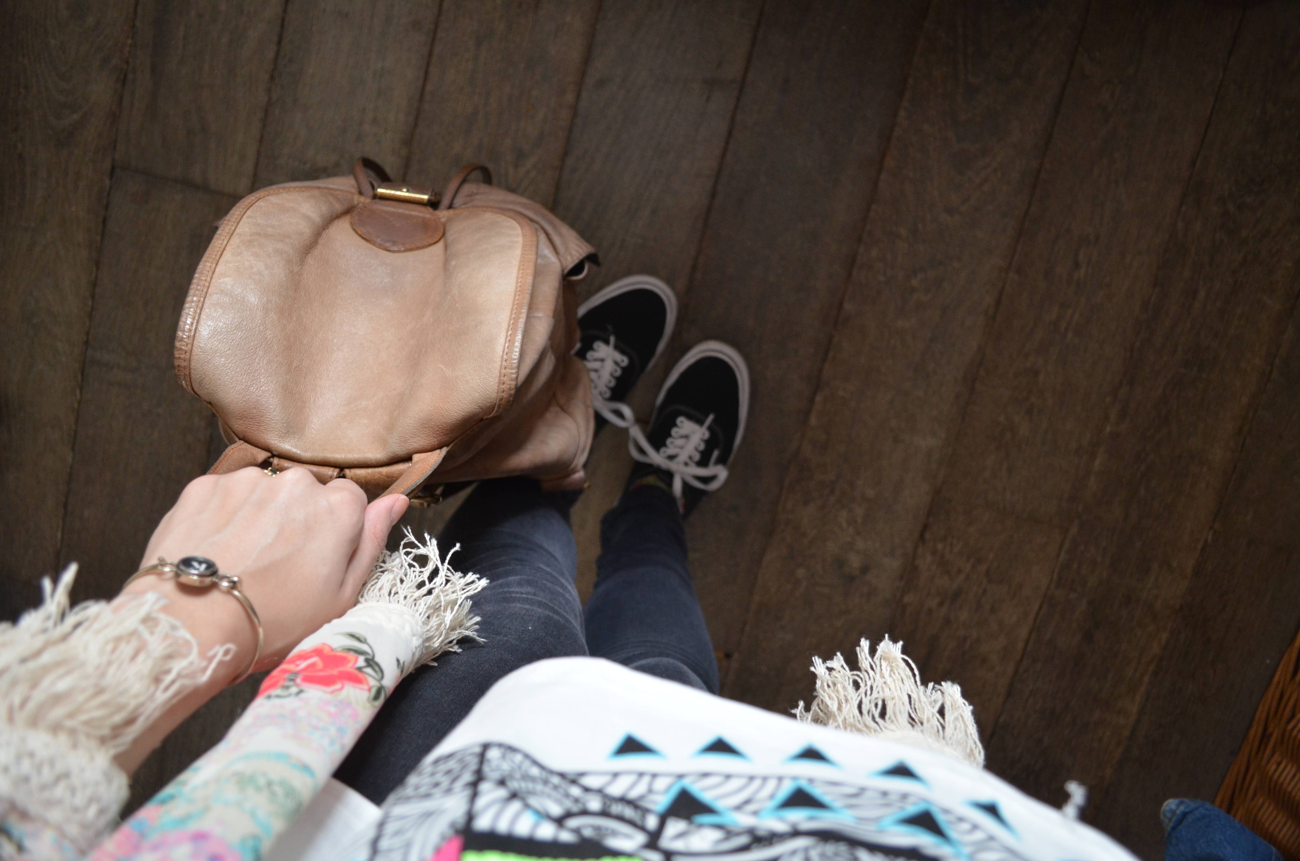 Striped top: ROMWE | Eye top: ROMWE | Boots: Frye | Lips bag: River Island circa 2011 | Kimono: ROMWE | Trainers: Vans | Skirt: Urbancode London, last season; similar via All Saints | Bracelet: Churoncalla | Coin Necklace: via London market | Quartz necklace: The Crystal Divide | High waisted jeans: All Saints | Weekender bag: Souks in Marrakech | Denim shirt: ASOS | Jeans with zippers: Insight via ASOS | Rucksack: via London market circa 2010