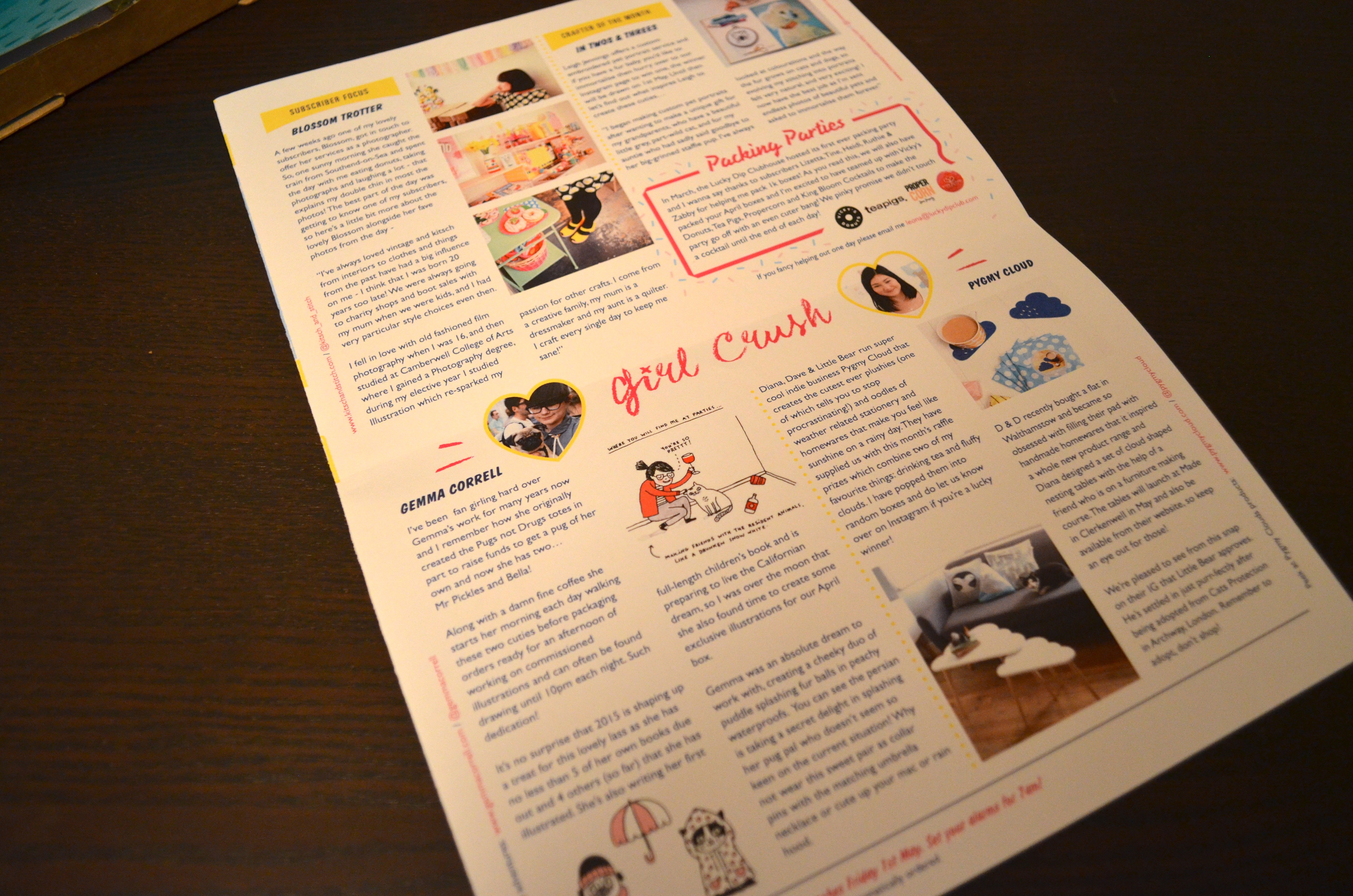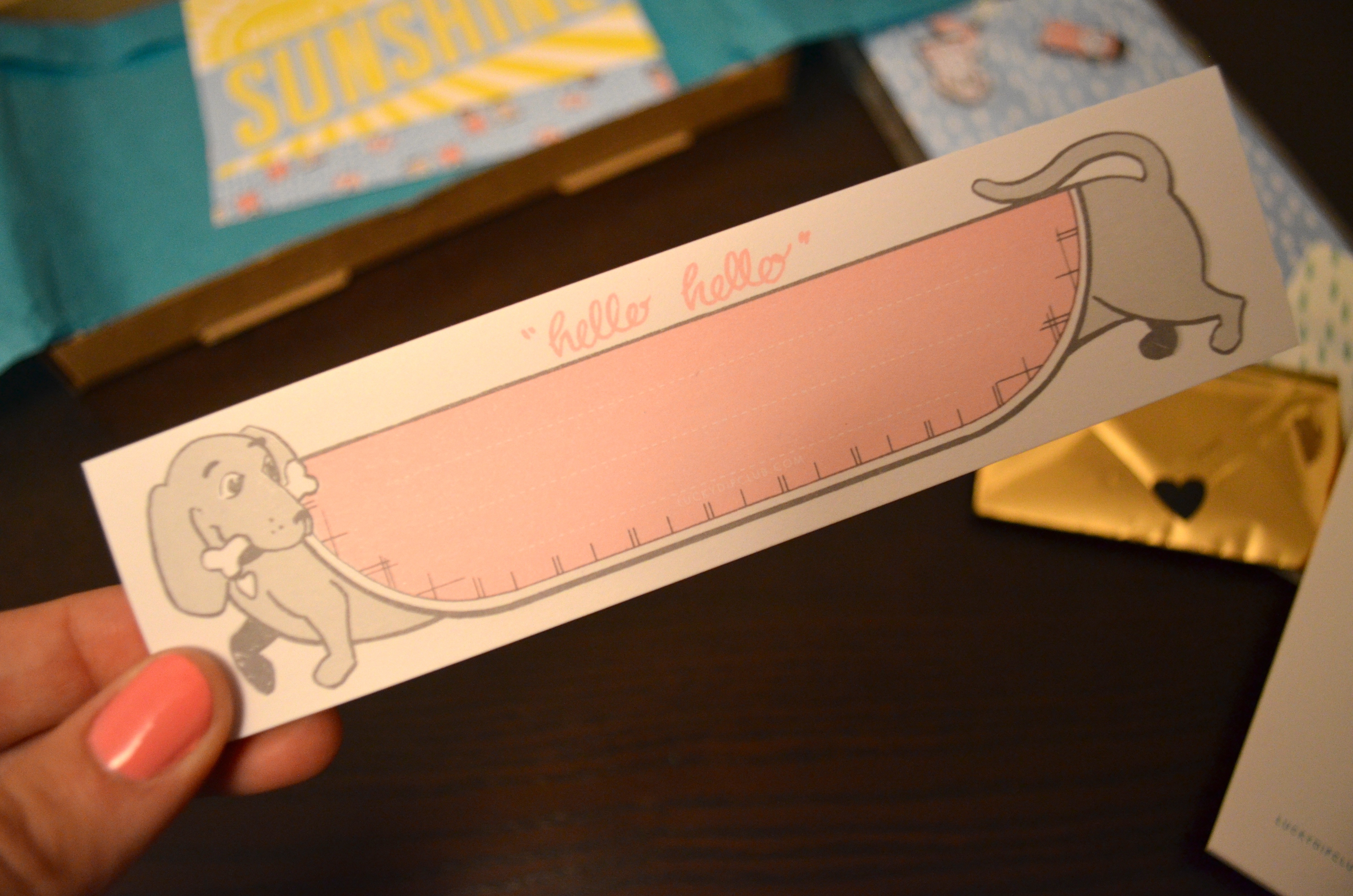 Also inside my box were a few book plates and a bookmark with my first initial (perfect for a rainy day reading club), sticky notes with an illustration of a sausage dog wearing a blanket, post cards (one wishing sunshine, the other featuring Gemma’s pug, kitten and umbrella) and a wee fold up paper magazine. All bang on theme!