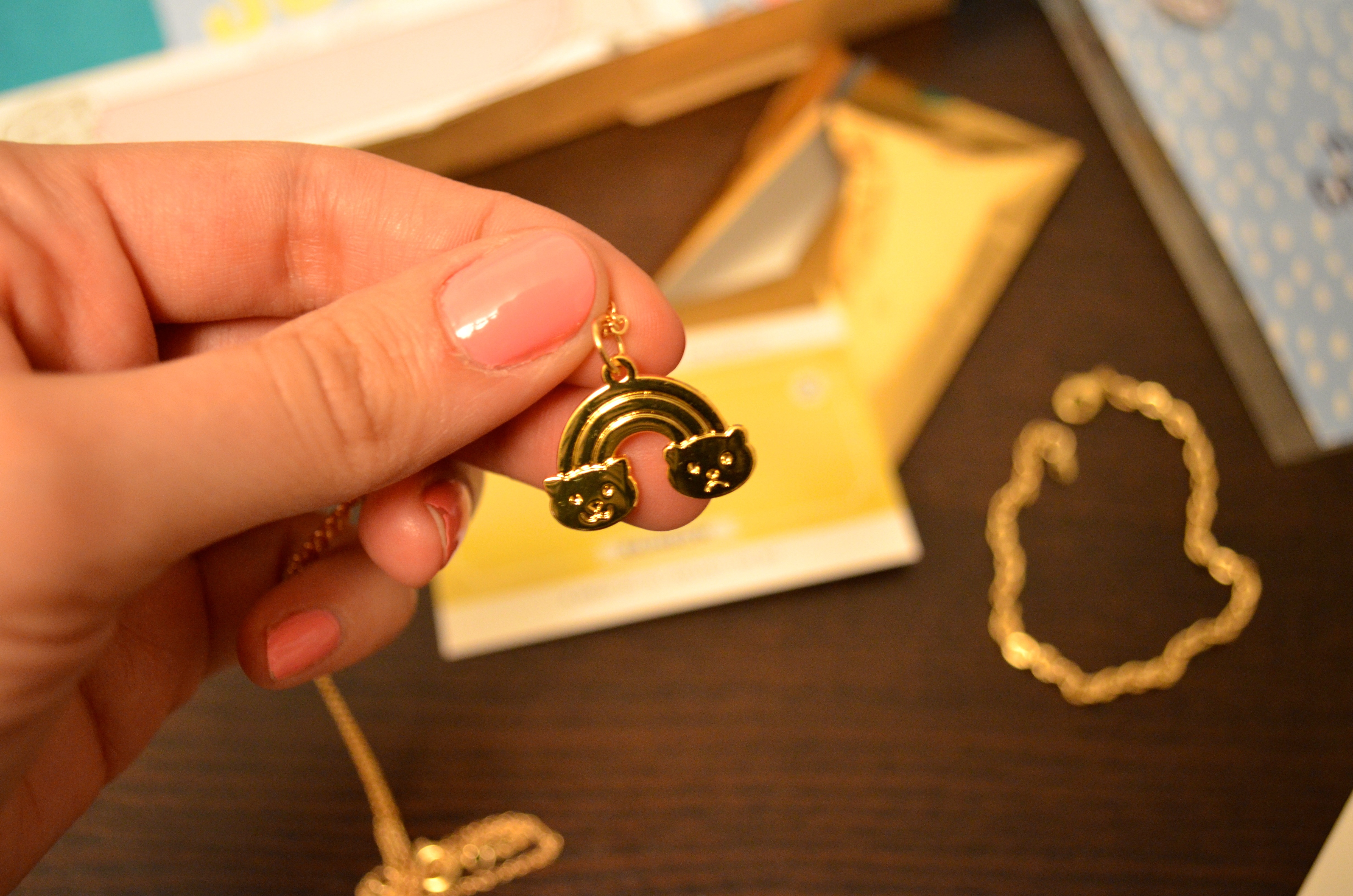 From March until December the Lucky Dip Club boxes will each contain a Charm of the Month, and the first box ordered will have both a bracelet and a necklace (in your choice of gold or silver – you pick when you order your first box!) that you can put the charm on to wear. This month the charm was a little rainbow with clouds on the end; the left cloud featured a smiley face and the right cloud a frowny face.