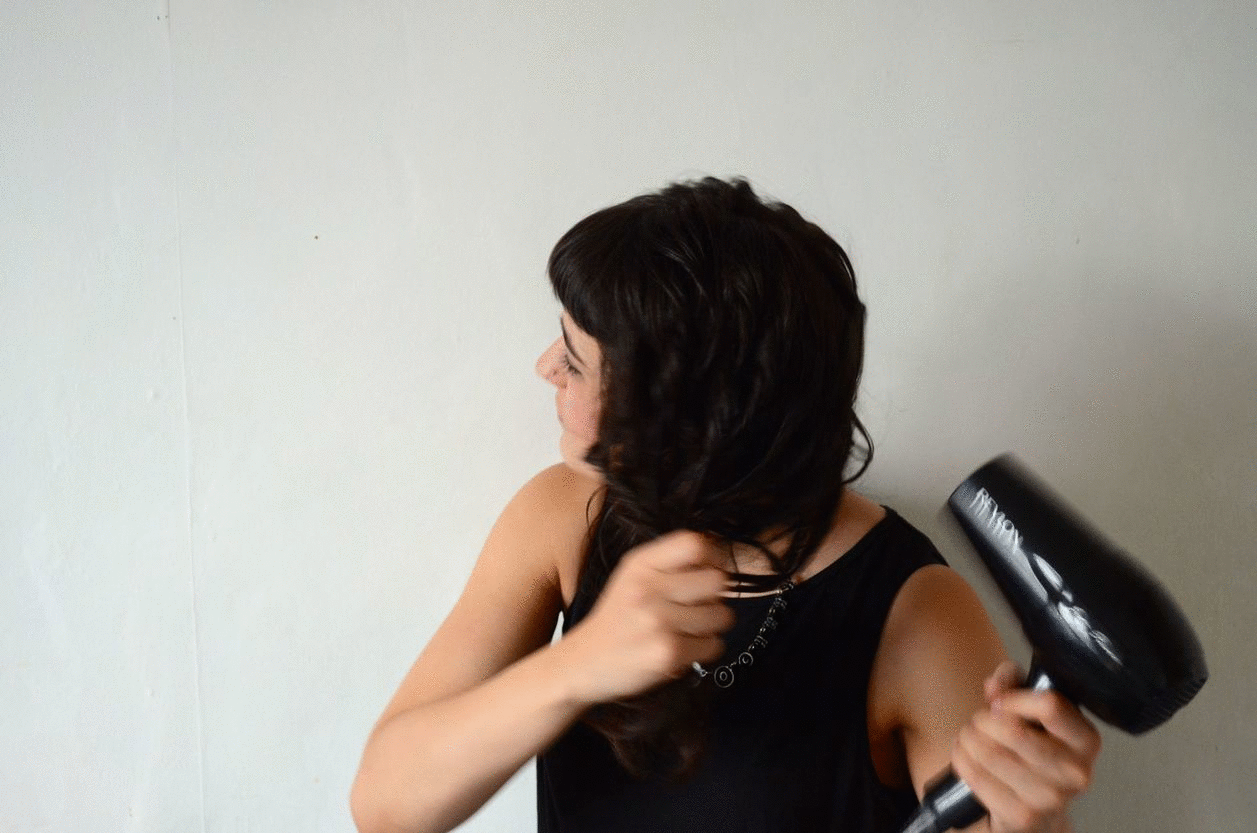 First up: I need to dry my fringe! I’m a bit lazy so I don’t use a brush for this, but instead just run my fingers through it while blowdrying from above. I like how this method keeps a bit of movement in the fringe, so that it doesn’t look too straight against the curls I’m about to work in.