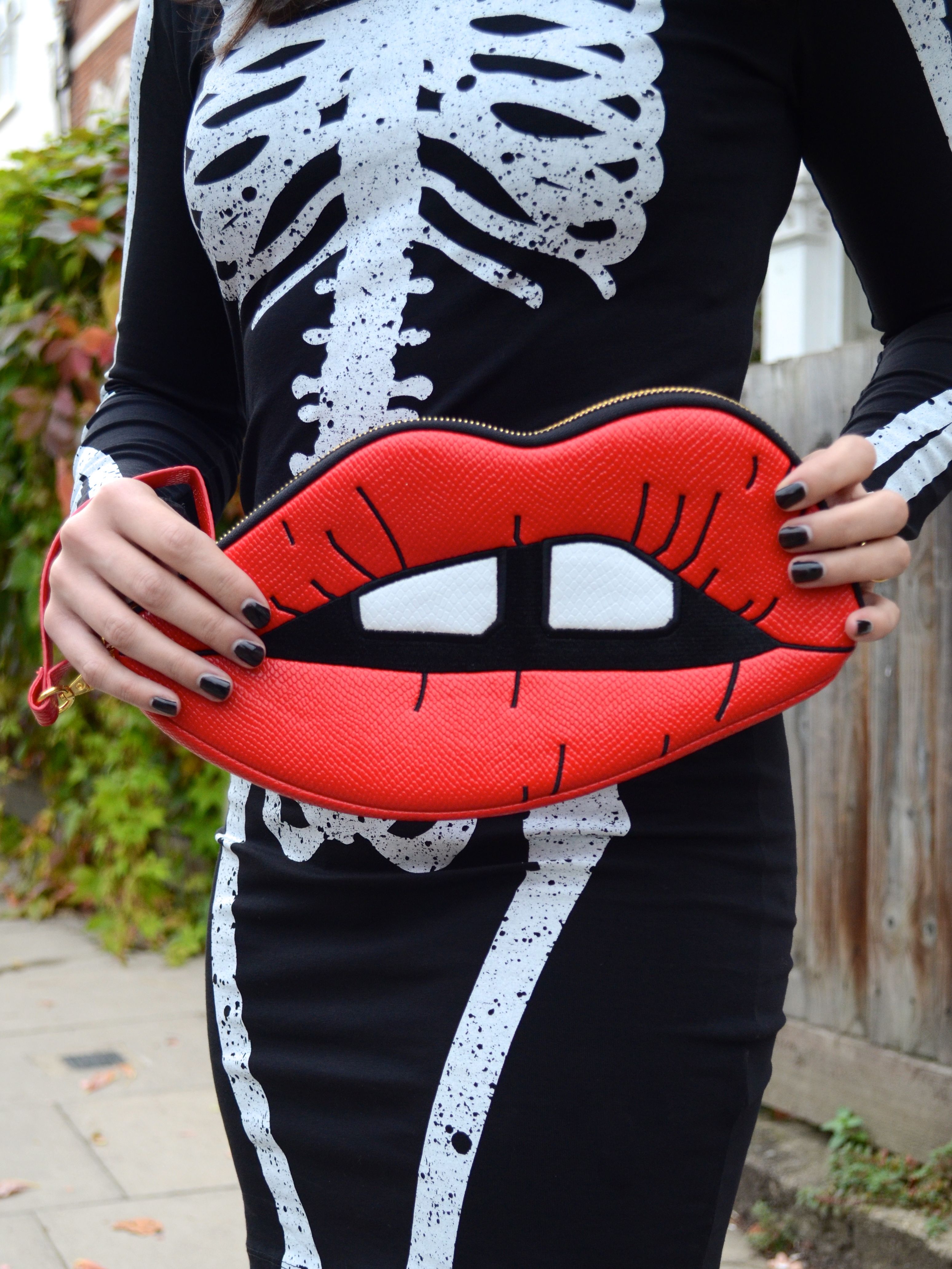 For the bag I wanted something that could bring a dash of colour to this monochromatic look. While I considered going for something colourful from this year’s faux fur trend (like this bag by ASOS), I loved how this bag by Skinnydip London had a Rocky Horror feel to it. It’s also a nice twist on the trendy Lulu Guinness lip clutches.