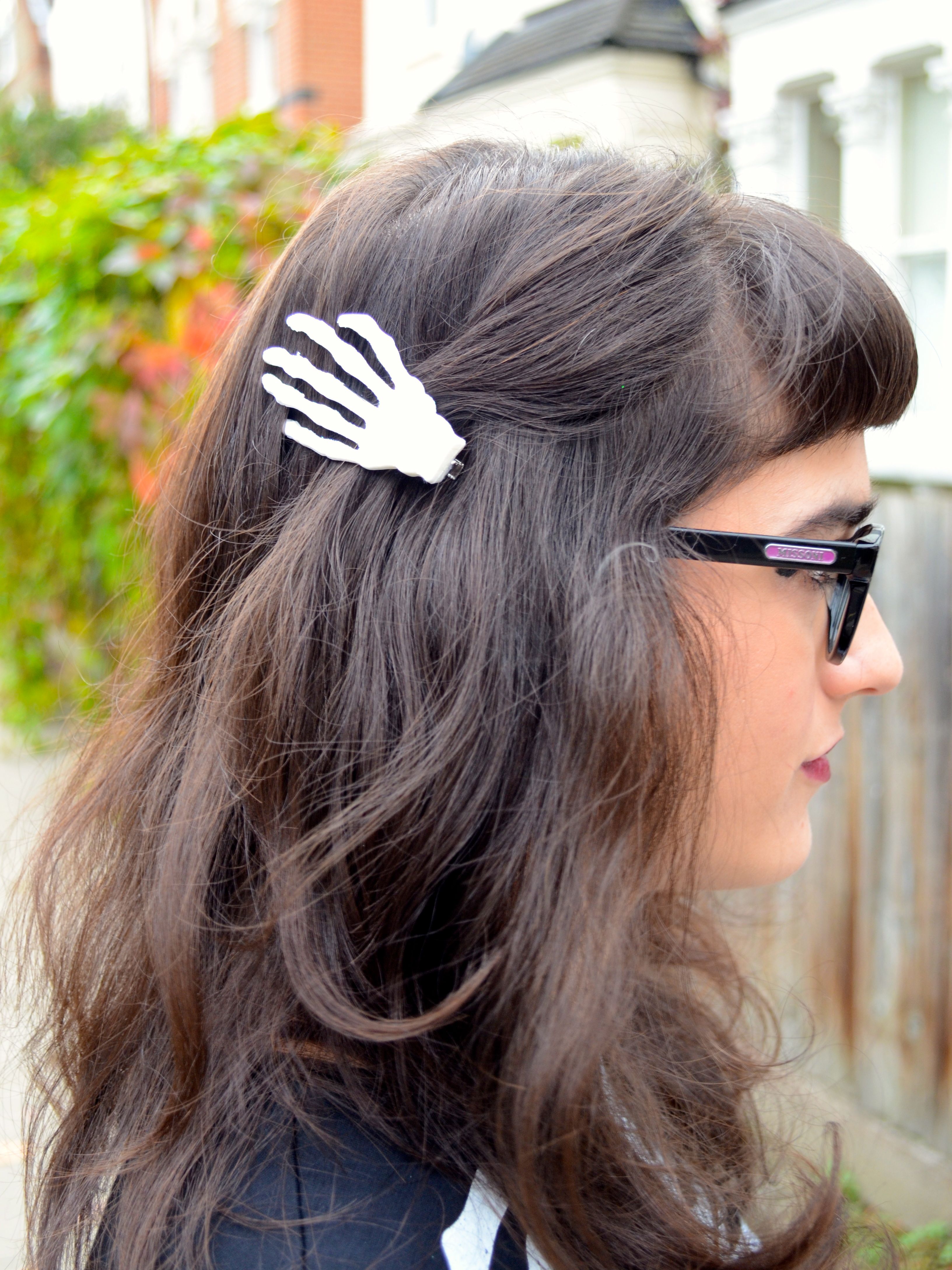 I’ve got a penchant for skeletons (if you couldn’t tell from the dress!), and while I was at H&M looking for Halloween accessories I spotted these hair clips and knew they’d be perfect for this look.