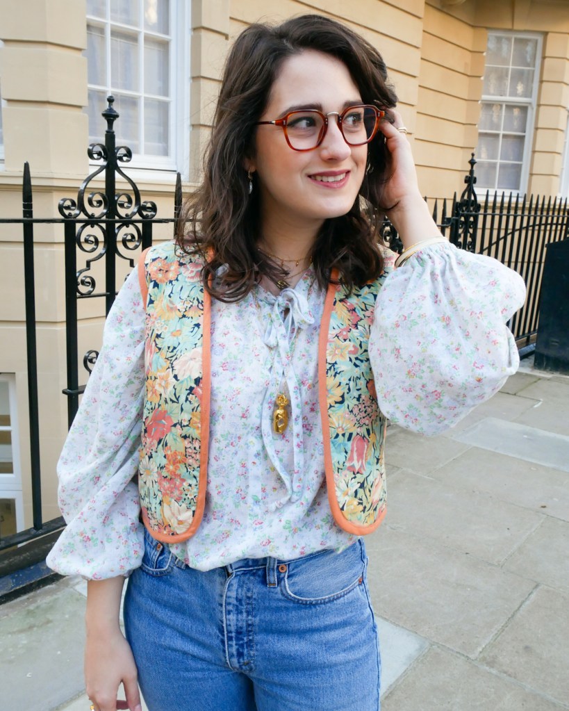 Image description: Katie wears a cream blouse with billowy sleeves elasticated at the wrist, a floral waistcoat, high waisted jeans cut off at the ankle and white cowgirl style boots. She’s on a London street corner in front of a peachy coloured building.